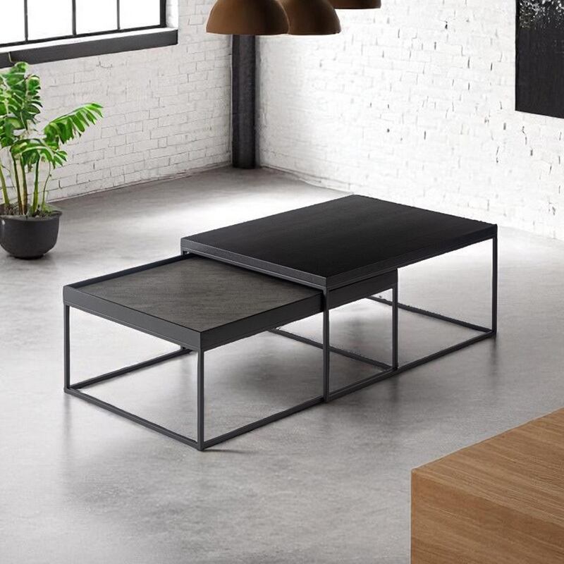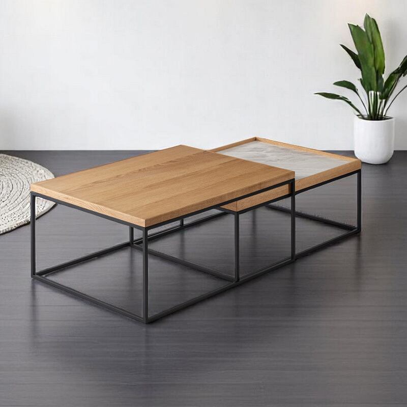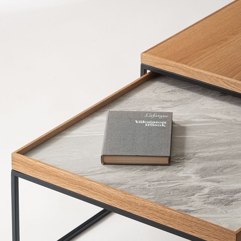 テーブル ローテーブル センターテーブル ネストテーブル セット モダン オーク材 大理石調 スチール製 トレー ブラック 80×60cm 収納式 コンパクト 伸長 伸縮