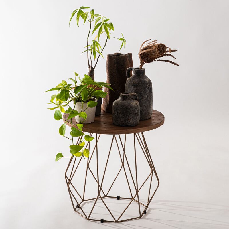 サイドテーブル 丸テーブル アイアン ミンディ材 無垢材 天然木 円形 花台 フラワースタンド ゴールド アンティーク ヴィンテージ 直径50cm