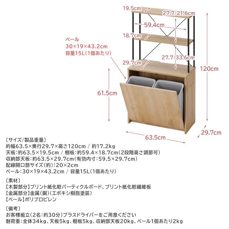 耐荷重:全体34kg、天板5kg、棚板5kg、収納部天板20kg、ペール1個あたり2kg