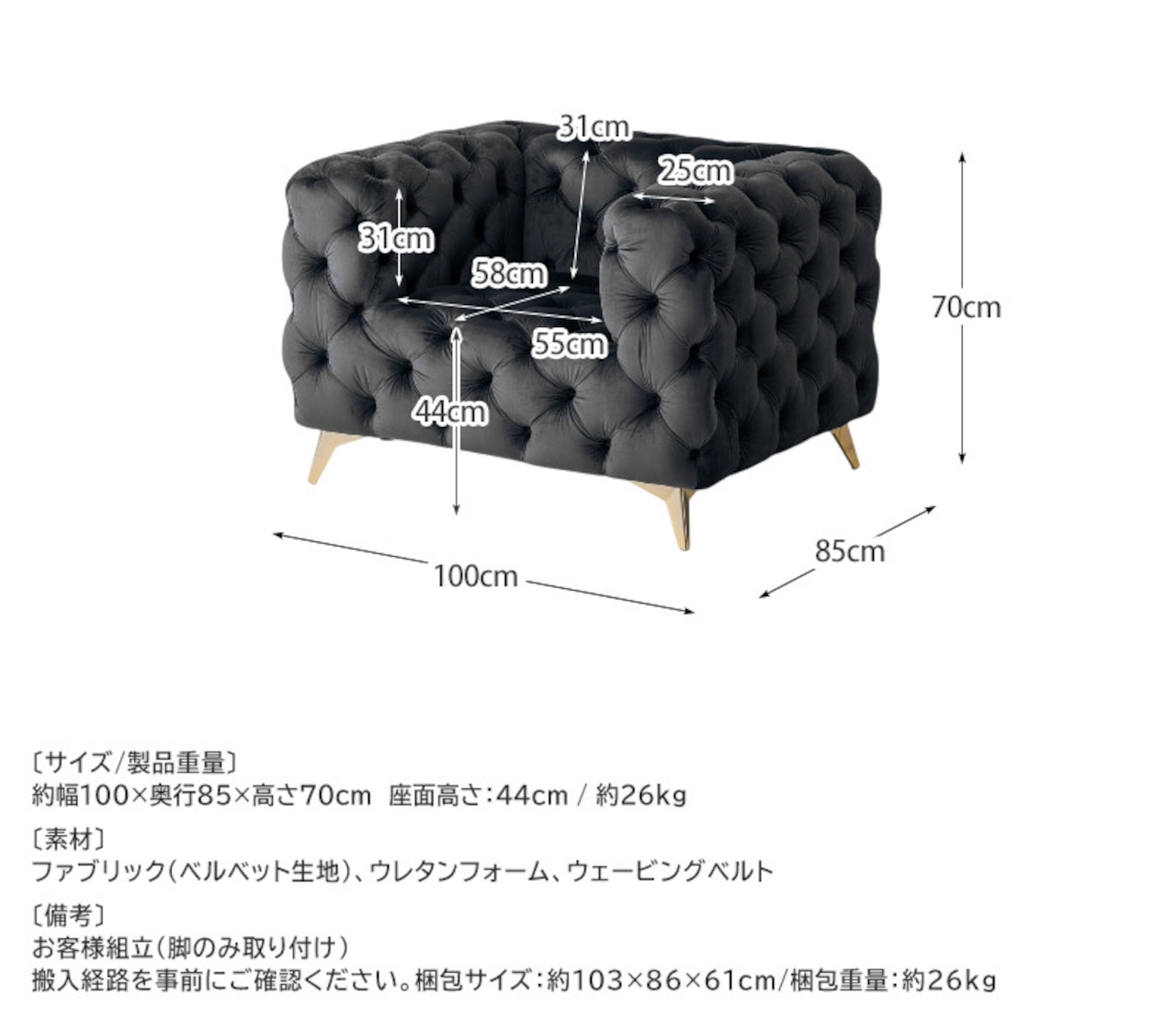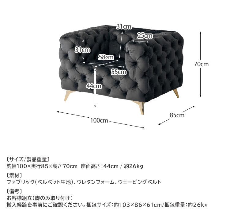 搬入経路を事前にご確認ください。梱包サイズ:約103×86×61cm/梱包重量:約26kg