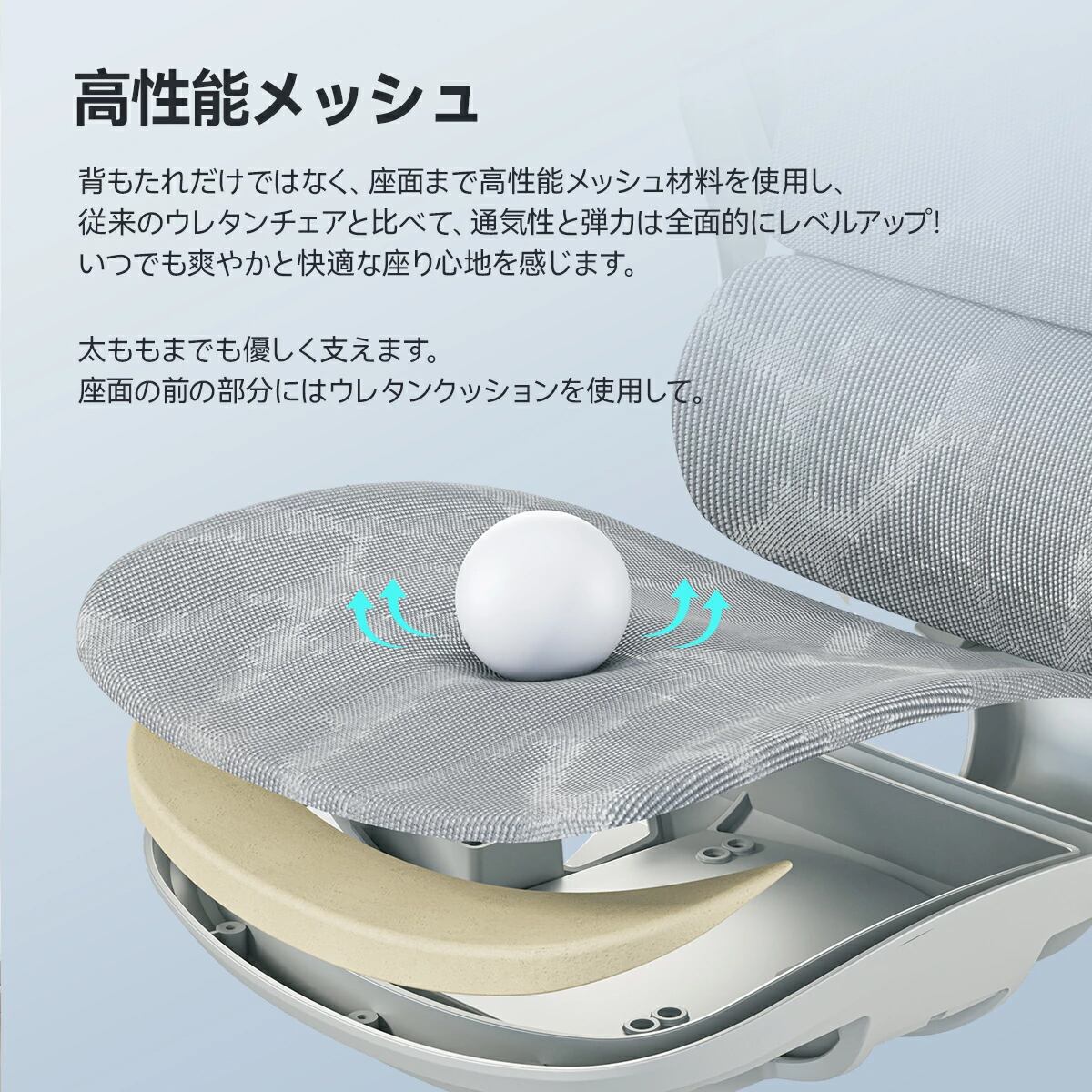 長時間使用できる:高い通気性と高弾力のメッシュシート。座面の前方に太もも裏をサポートするクッション付き。