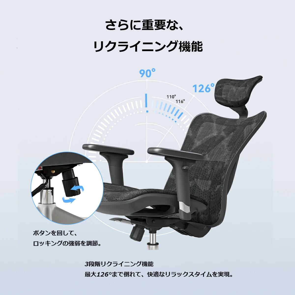 長時間使用できる:オールメッシュシートで高通気。座面の前方にクッション付き。3段階リクライニング。