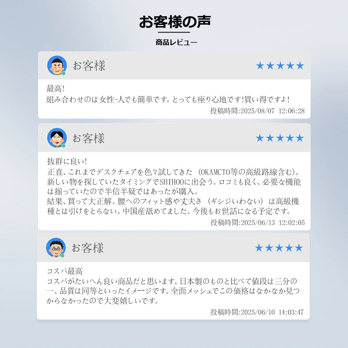 安全性認証:日本のJIS基準を上回る厳格なアメリカBIFMA規格認証を取得。12万回の耐久テストをクリア。