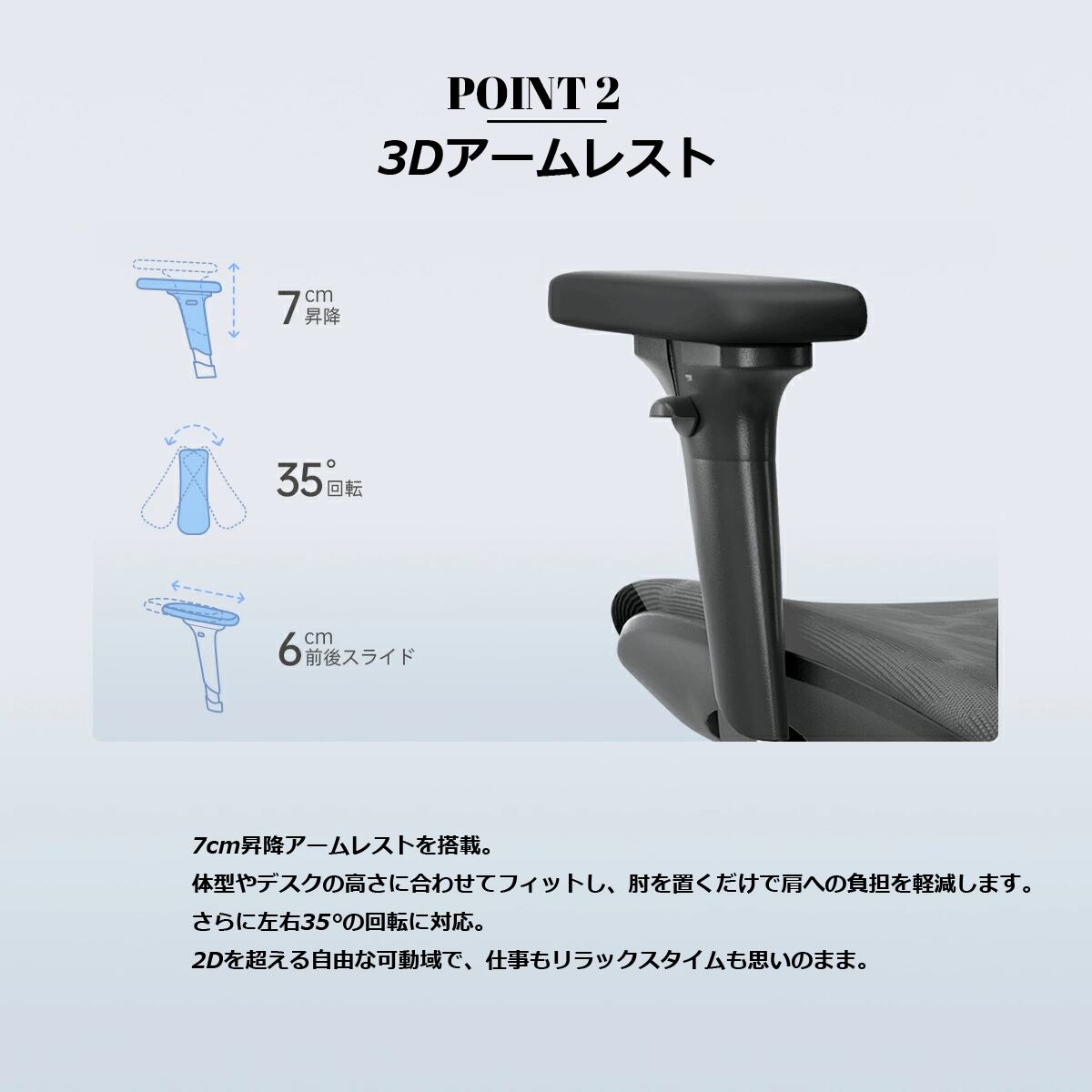 快適な作業をサポート:肘置きは、高さ調節、回転角度調節、前後スライド。ヘッドレストは、高さ、角度調節