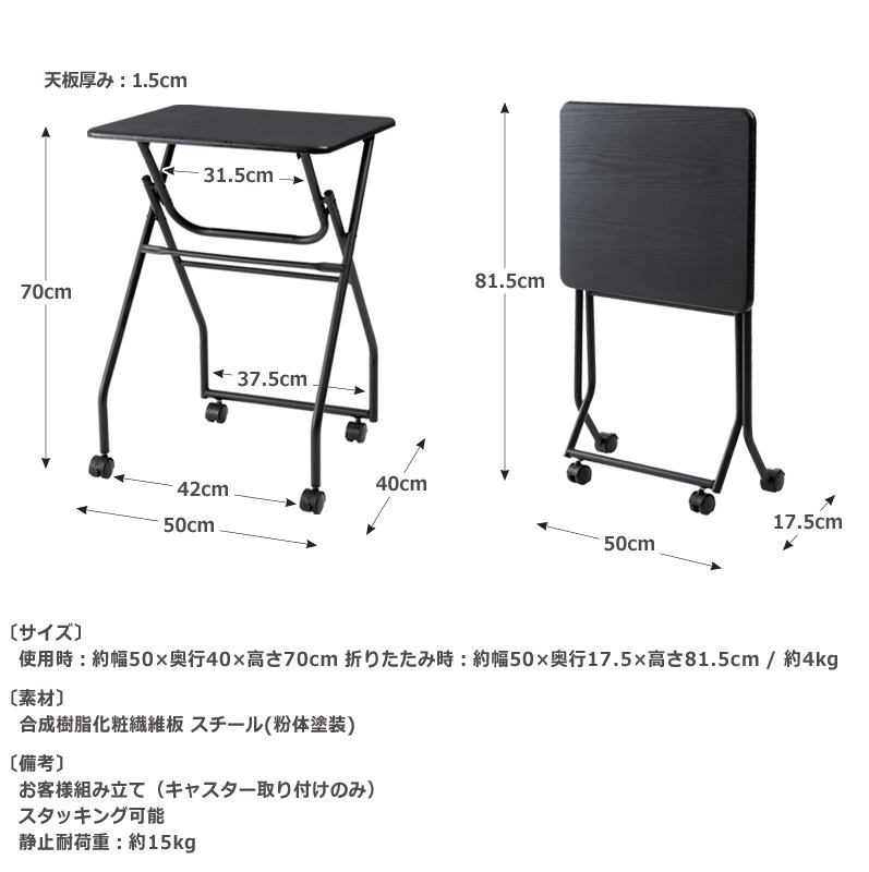 折りたたみテーブル 折りたたみデスク サイドテーブル 幅50cm 奥行40cm 高さ70 キャスター付き 木目柄 ハイタイプ パソコンデスク ブラック ホワイト ナチュラル