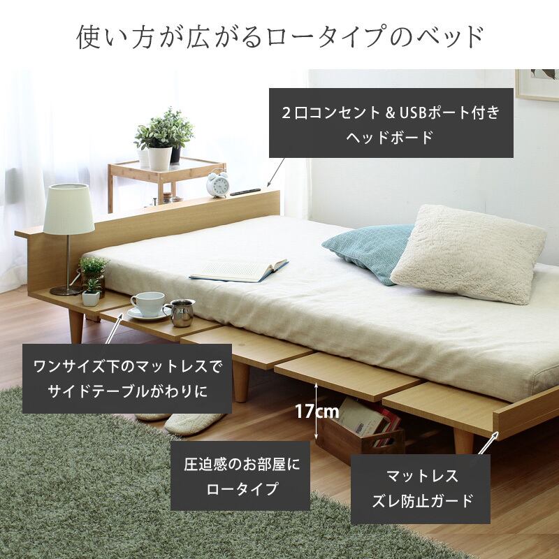 ベッドフレーム セミダブル 棚付き すのこ ローベッド ロータイプ フロアベッド 木製 宮付き ヘッドボード コンセント USB 木目